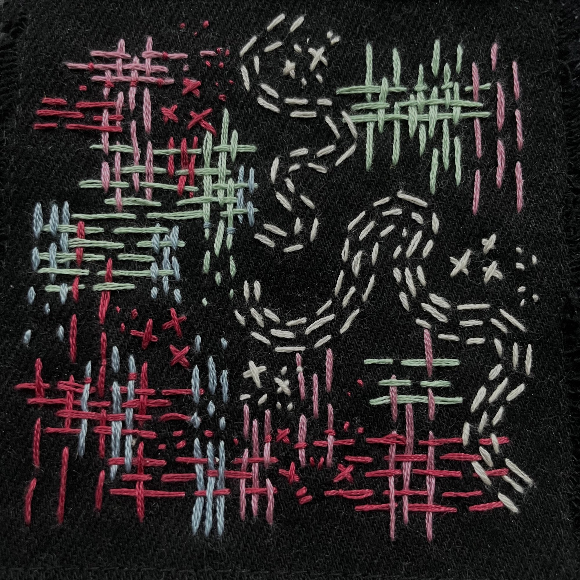 Green, Red, Pink and Blue Patch embroidered by hand.